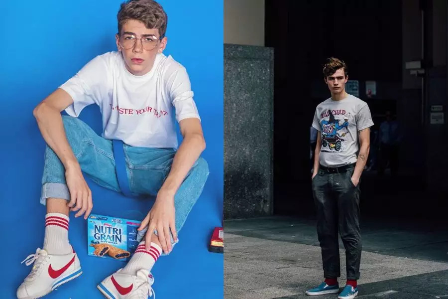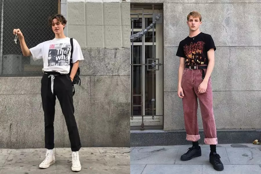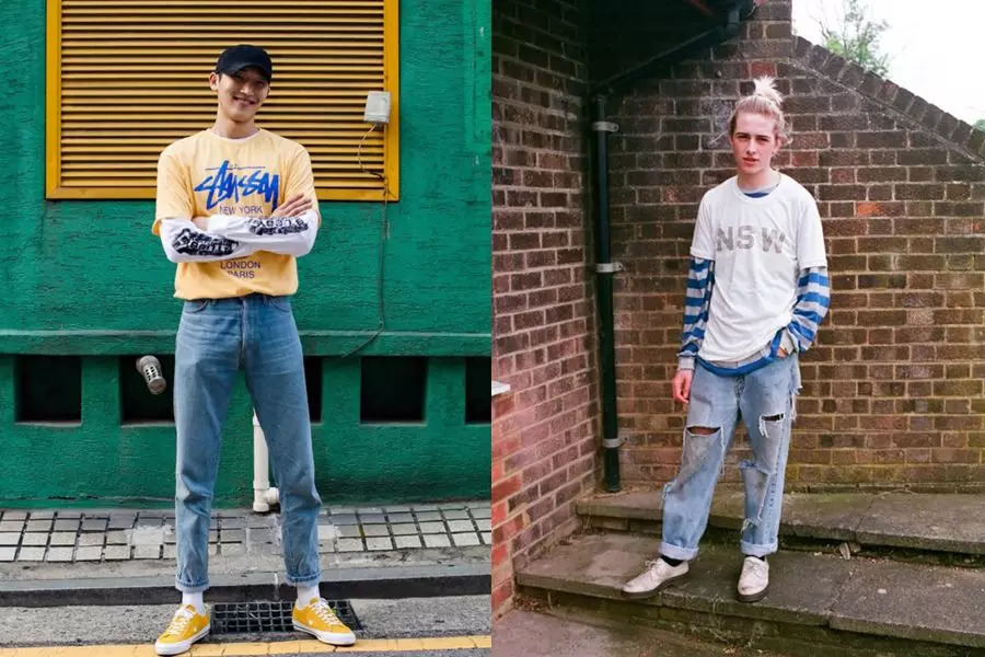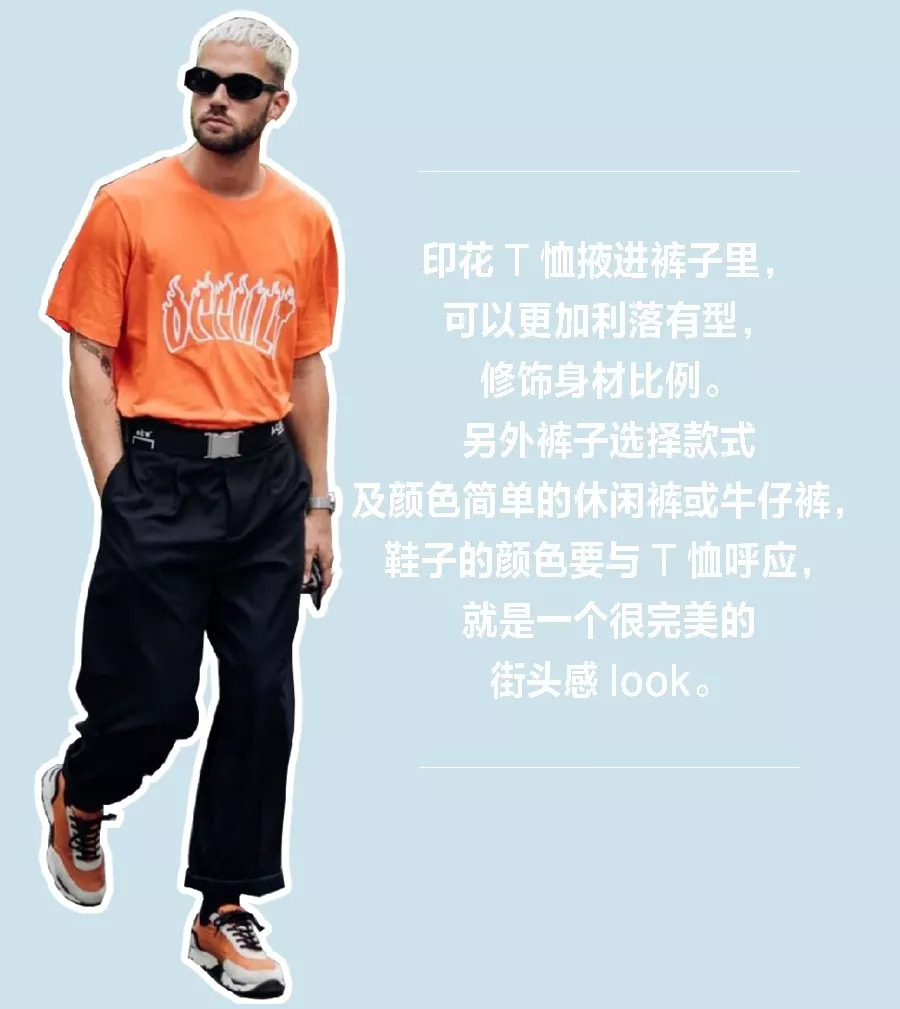 印花T恤内穿长袖T恤是当下比较时髦的穿法,需要注意的是长袖T与短袖T的颜色要有区别,长袖T可以选择袖子是纯色的或者条纹有图案的,鞋子的颜色仍要与短袖T一致,免得整体色彩种类过多而繁乱。