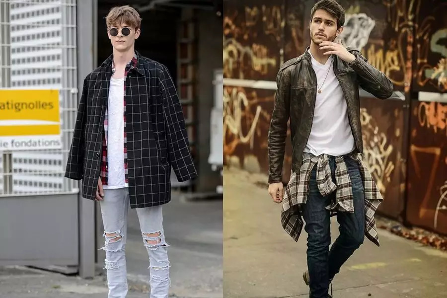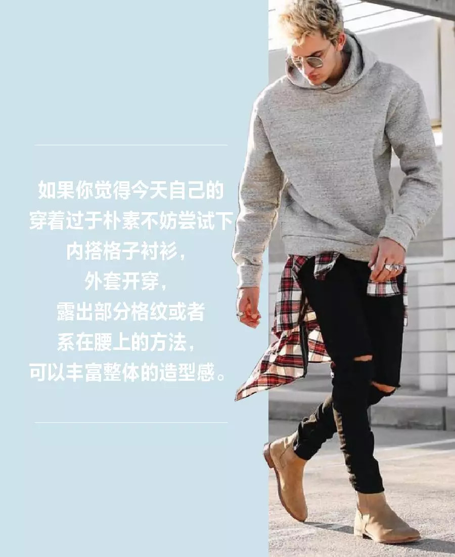 格子衬衫内搭圆领白T或长袖白打底,需要注意的是,格纹衬衫不要开穿,解开上面两个扣子,领口三角区露出白色打底,袖口卷起来,这样穿搭就比普通开穿显得更加利落干净、讲究高级。如果衬衫较长最好扎进裤子里。