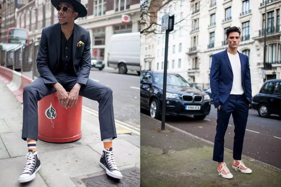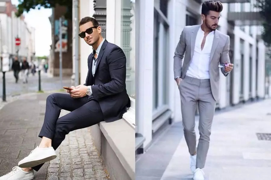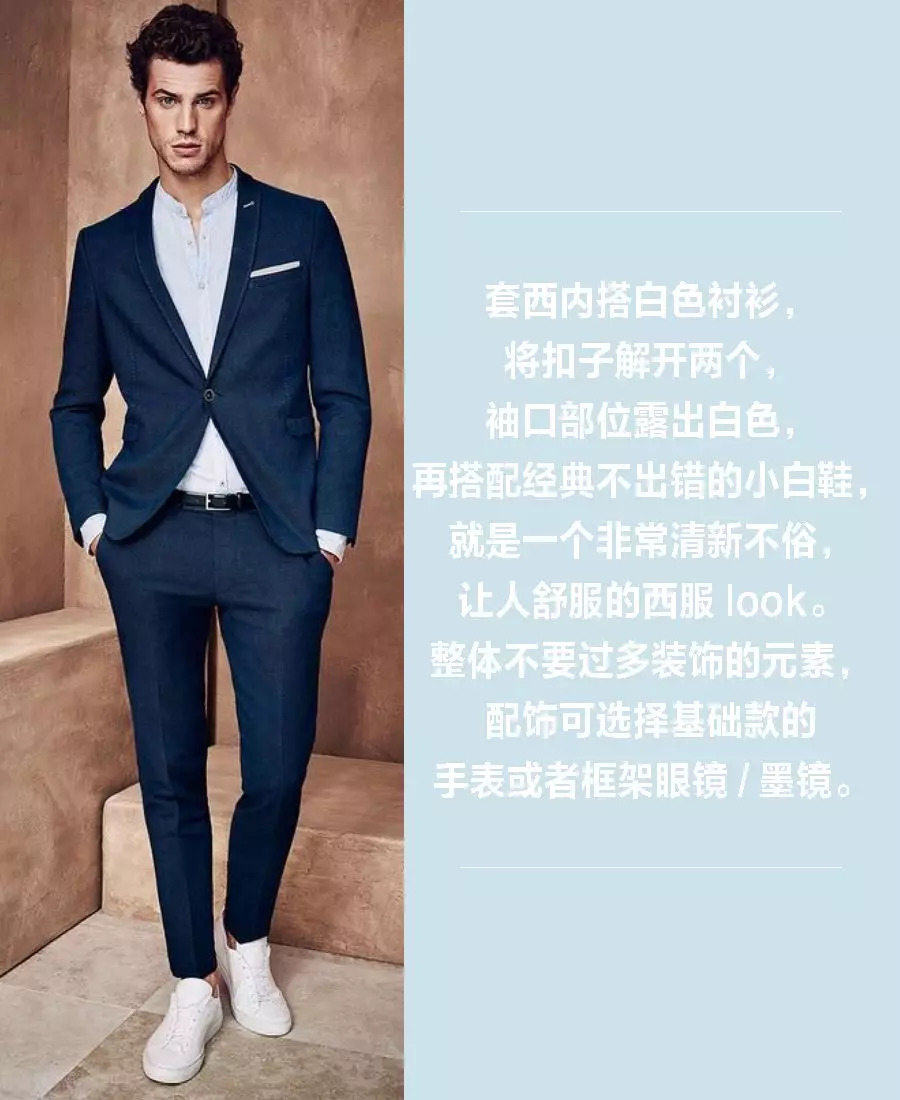 套西空身内穿针织衫(开穿/V领/圆领),可以弱减西服的正式感。搭配休闲运动鞋(颜色与针织衫相近)和帽子,使整个造型更有活力,小礼帽和鸭舌帽等都是很好搭的单品。