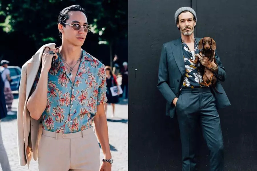 丰富的印花衬衫非常适合夏天,但是过于花哨的款式让很多人望而却步。将单调的纯色西装与印花衬衫结合,能很好地从色彩上提升西装的趣味感,西装大面积的纯色也能收敛印花的突兀,包容性更大。