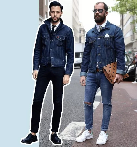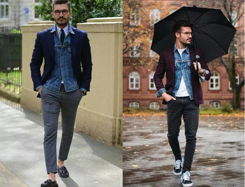 将牛仔夹克夹穿在西服里面,内穿衬衫或圆领白T,既不会太商务,休闲感也适中,都是上班和约会极好的选择。需要注意的是夹穿牛仔夹克上下的扣子都不要扣满,袖口要露出一部分的牛仔与整体造型呼应。