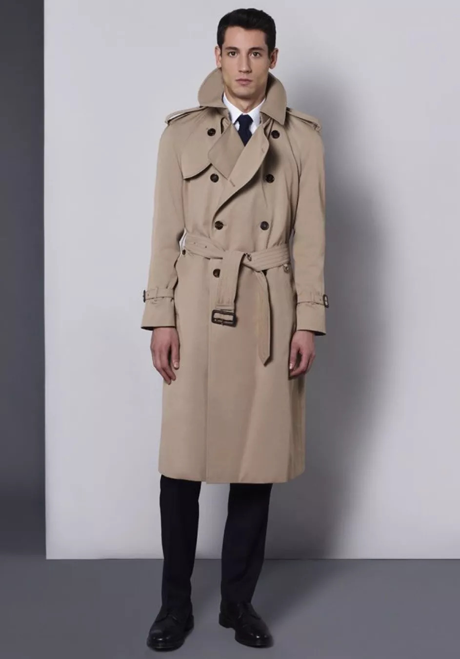 作为经典款风衣,几大必备元素是大翻领、肩章、双排扣、腰带和袖口带,而最经典的穿法就是白衬衫配黑领带,风衣扣子扣满,是商务绅士的典型look。