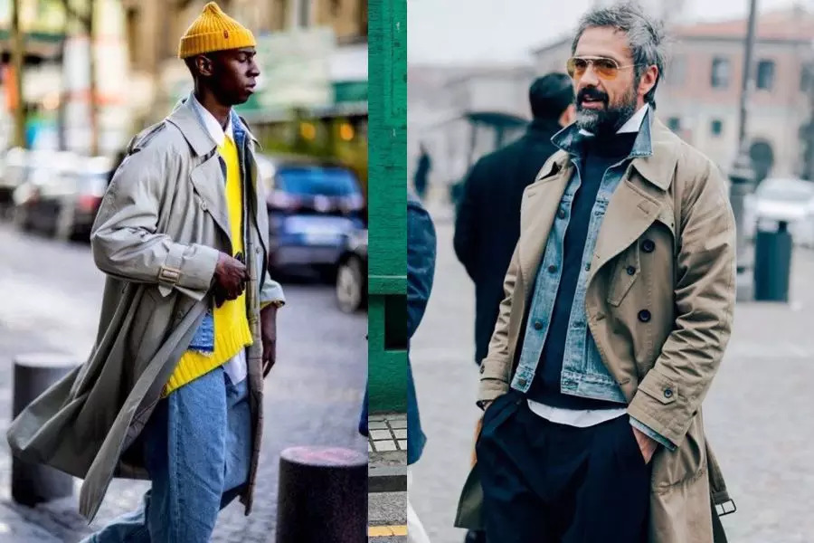在风衣里面夹穿一件牛仔,给传统造型加入活力的元素,不会显得死板。需要注意的是风衣要开穿,整身大面积的色彩不要超过三个。