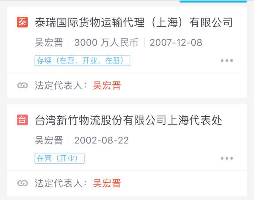 此外有报道称,台湾新竹货运集团也参与到顺心快运中,但无法证实ASL HOLDING LTD与台湾新竹物流之间的关系。但尚广投资的唯一股东泰瑞国际货物代理有限公司的法人为吴宏晋,界面记者从启信宝查询发现,其为台湾新竹物流上海代表处的法人。在一家已经注销的海欣泰物流公司中,新竹物流持股50%,吴宏晋担任董事兼总经理。台湾新竹物流集团成立于1938年,以合同物流起家,2017年营业额为150亿台币(约合36亿人民币)。