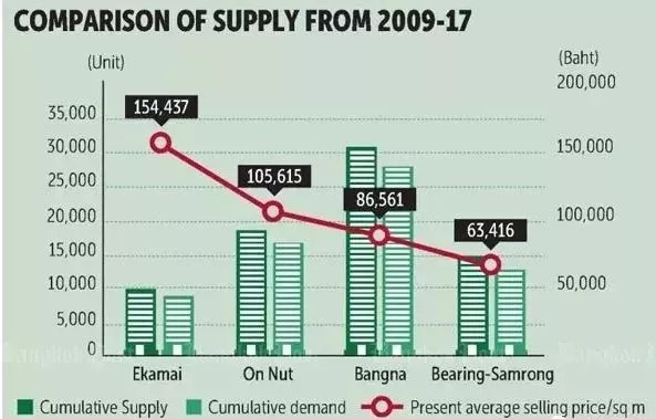 Ekamai的平均销售价格为每平方米154,500铢,而在Ou Nut, Bang Na和bearin - samrong的平均售价分别为105,600铢、86,600铢和63,500铢。很明显,坚果、Bang Na和Bearing-Samrong的价格要比Ekamai低,尤其是在以百分比计算的时候,分别是32%、44%和59%。