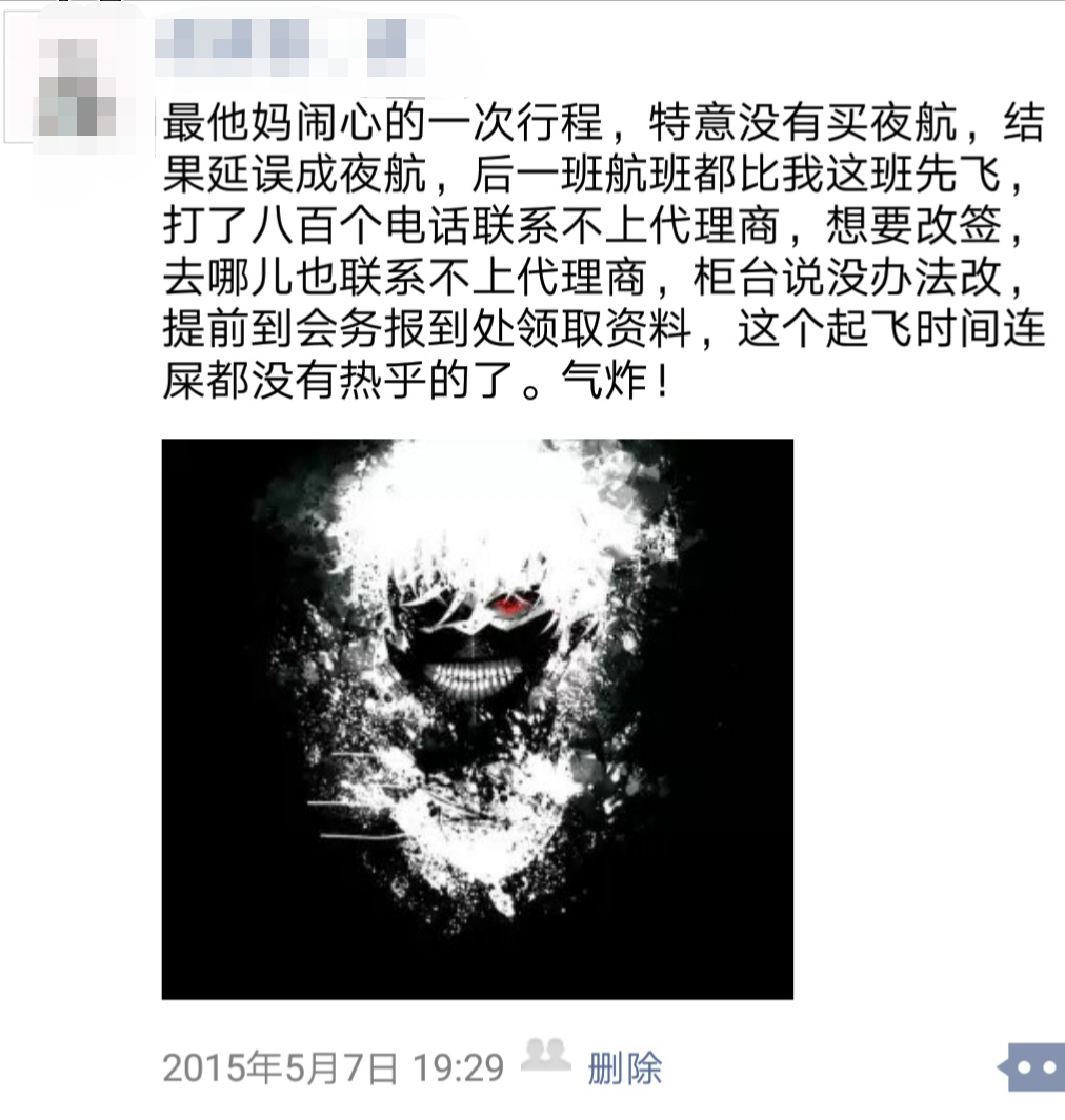 但还是得继续联系“去哪儿”客服,这时的客服似乎完成了一个轮回,又开始回复“正在联系代理商,稍后回复”。“我真生气了,折腾我这么多次,来来回回都是车轱辘话,问题一点不给解决态度再好有什么用!”眼看着欲改签的航班在多次交涉中也即将登机,她的焦躁和愤怒终于爆发了,先是控诉了客服只让等不办事,又怒火中烧地要求她提供代理商的电话,准备喷它一喷。