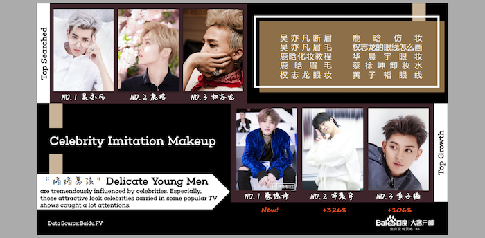 同时,吴亦凡、鹿晗和权志龙等诸多“带妆”男星,成了这类男士打板面部妆容的首选。此外,“蔡徐坤卸妆水”成为最新的搜索热词。