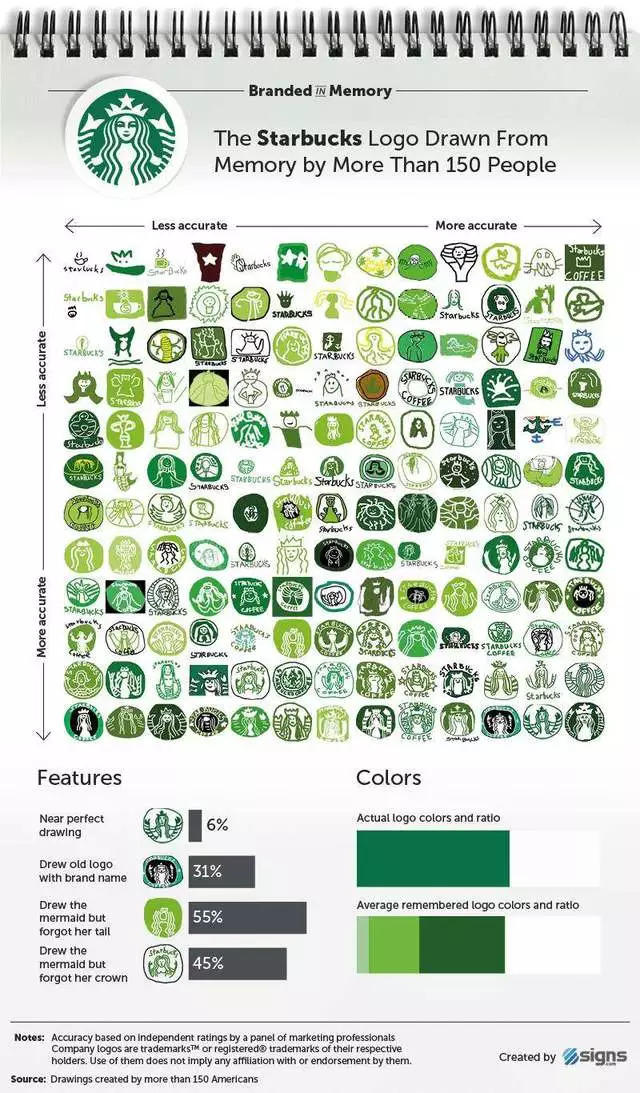 很多人都认为星巴克的美人鱼 Logo 不错,但真让人们拿笔去画的时候,45% 的人会忘记她戴了皇冠, 55% 的人忽略了她的双尾巴......
