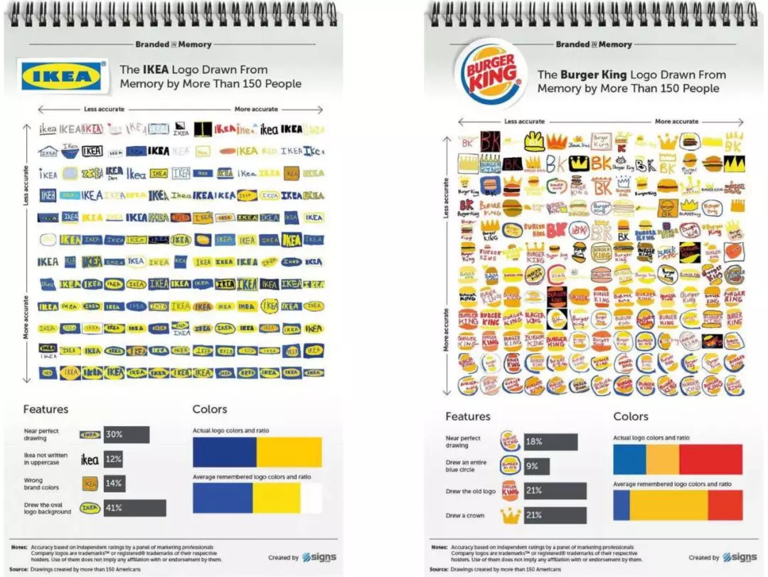 这里要说回到开头“画 Logo”这件事,这项实验找了 150 名消费者,让他们凭着自己的印象画出 10 个知名 LOGO (全行业)。后来,在 80 多小时、1500 多张图稿中,他们观察到,宜家是所有 Logo 中记忆最准确的,30% 的人能够几乎完美地重现其文字、形状和颜色的组合(苹果只有 20%)。星巴克是所有 Logo 中记忆最不准确的,能完美画出的只有 6% 。即便他们都能画出美人鱼,却在细节上出现了错误。