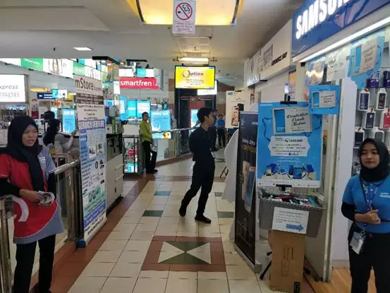 捷信印尼在合作的手机销售门店中,会配备服务人员。穿红色衣服的为捷信印尼工作人员,蓝色衣服为手机销售人员。