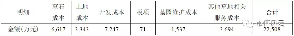 2017年福寿园实现墓地服务收入130,005万元,占收入的98.3%,包括定制艺术墓、成品艺术墓、传统成品墓、草坪卧碑墓、绿色环保墓和室内葬、其他墓地相关服务及墓园维护服务,而对应的墓地服务成本22,508万元,约占营业成本的77%,明细组成如下: