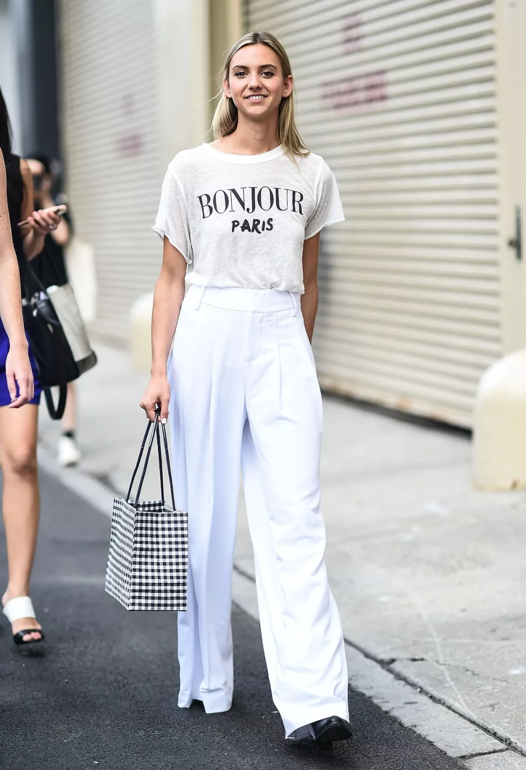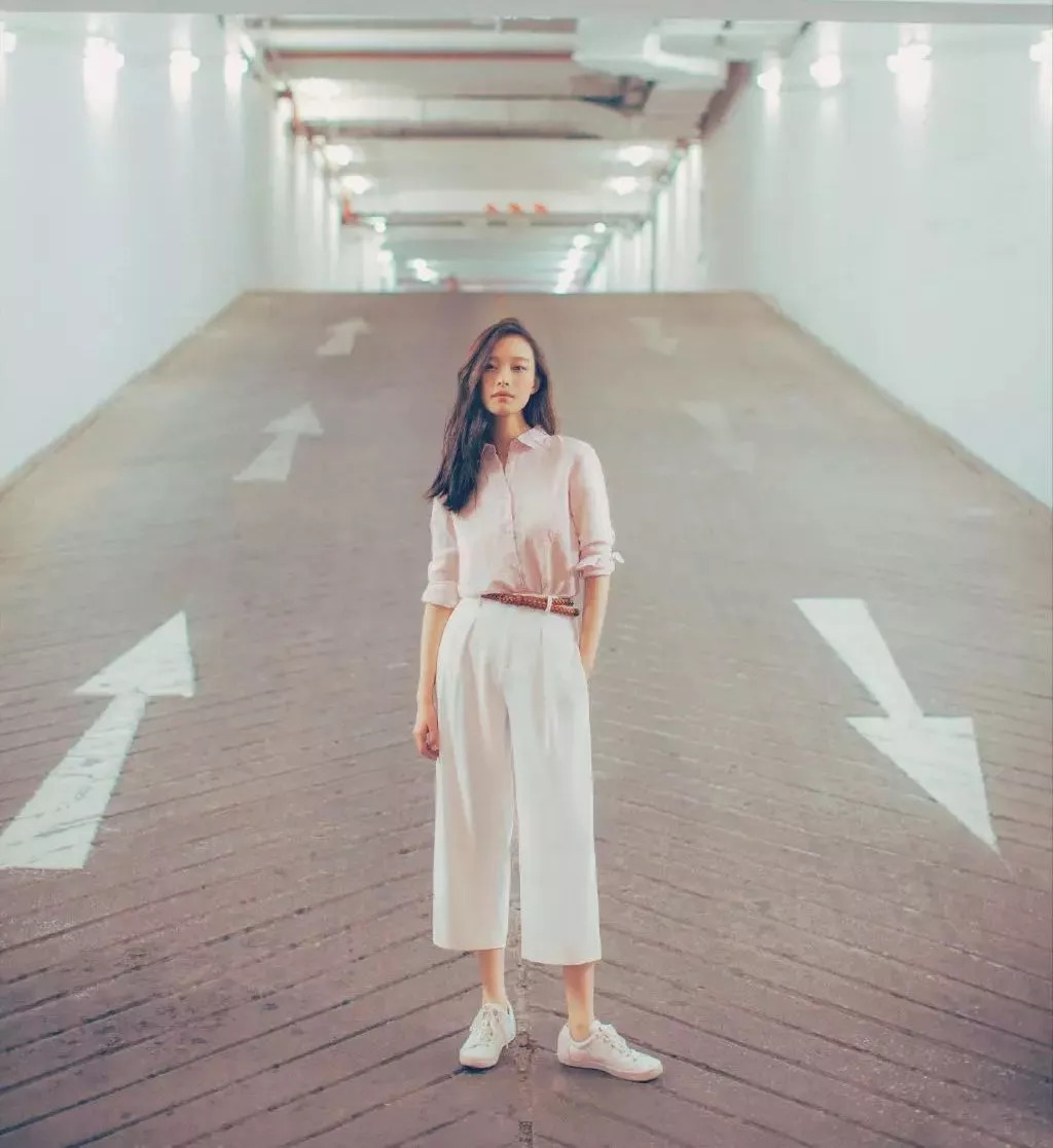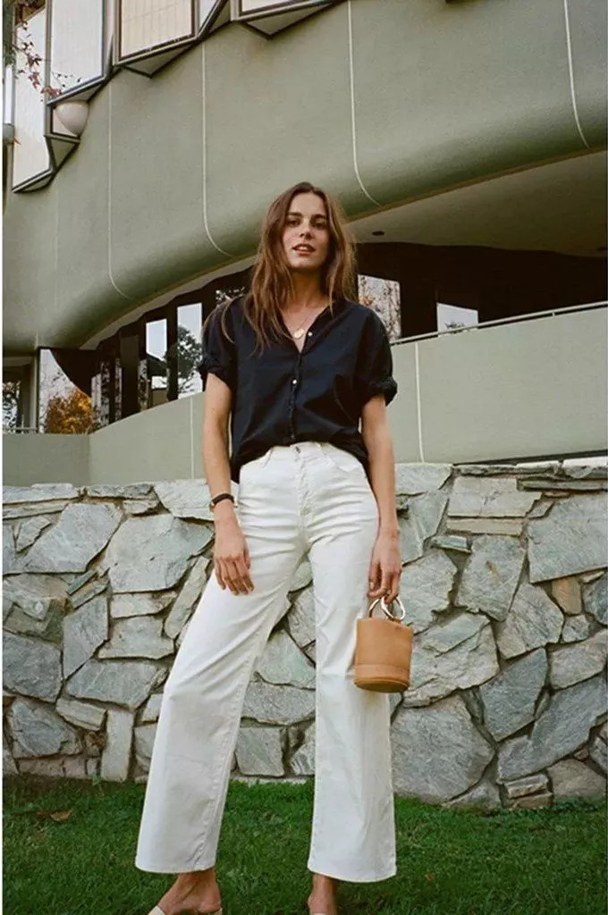 谁衣柜里还没有几件白T恤、白衬衫了,但大家都习惯搭配黑裤子或者牛仔裤穿,所以大家看起来都差不多。不如试试把裤子换成白色阔腿裤。
