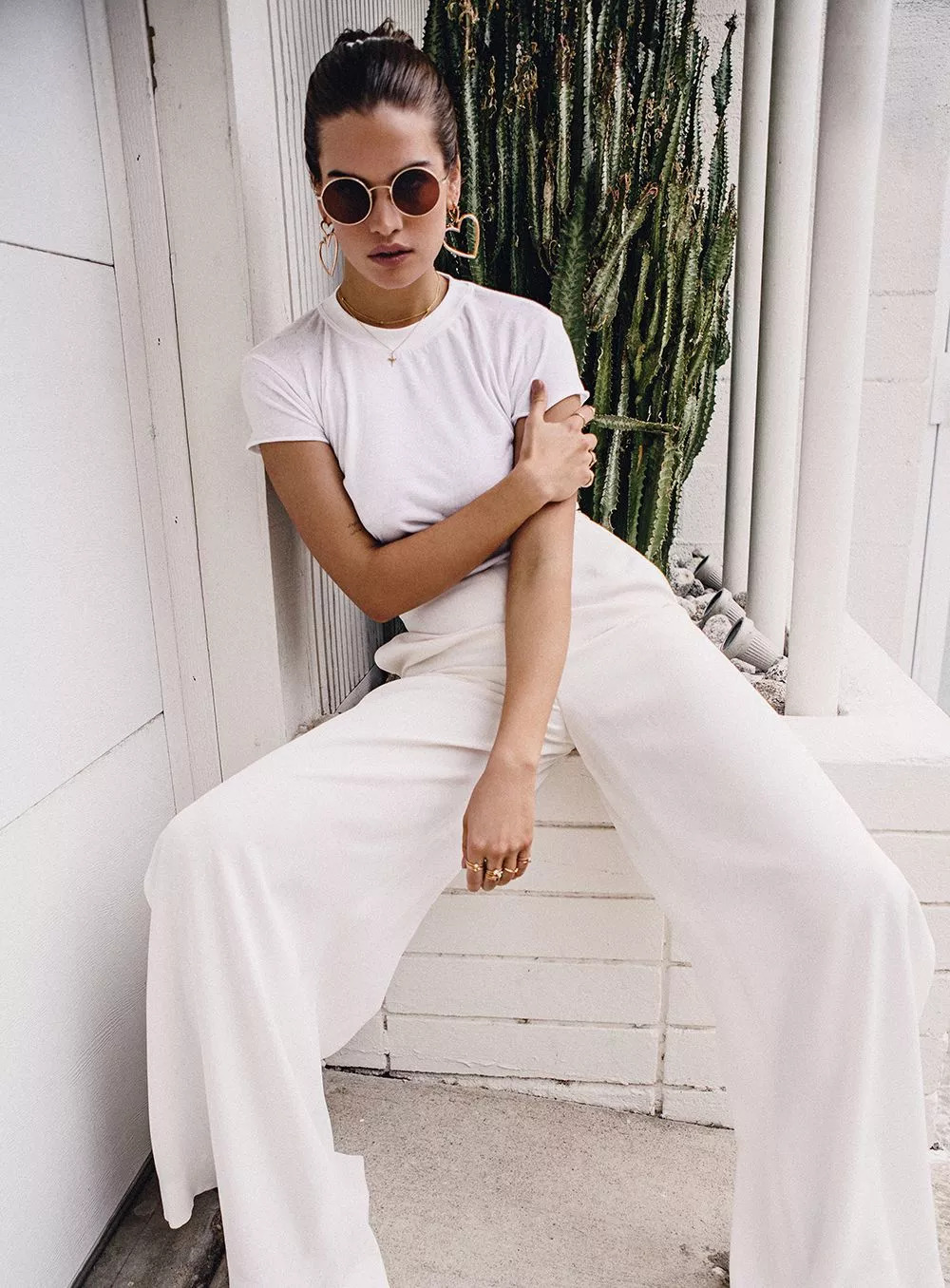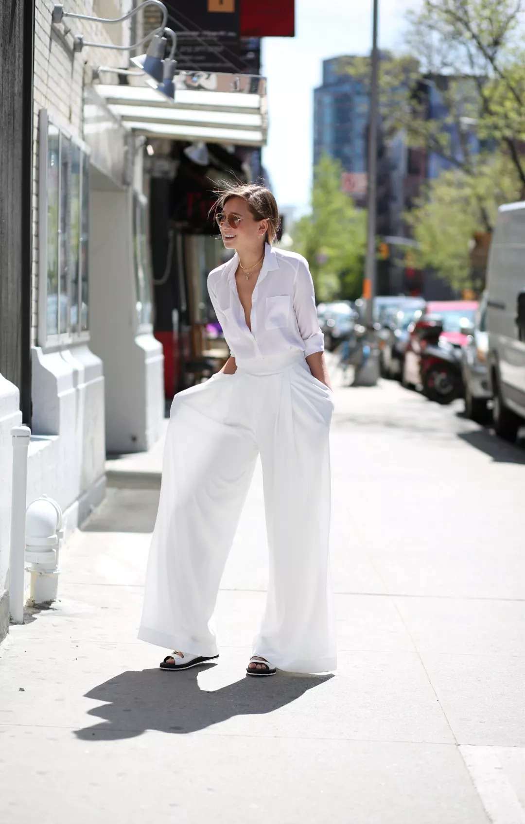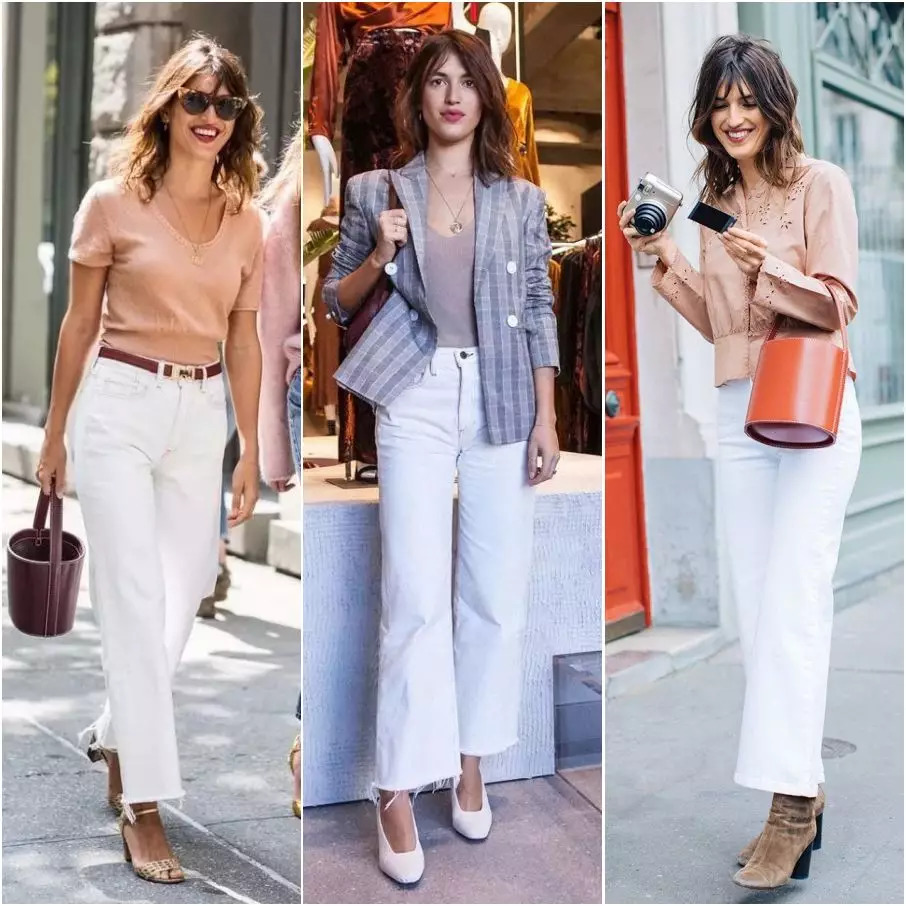 谁衣柜里还没有几件白T恤、白衬衫了,但大家都习惯搭配黑裤子或者牛仔裤穿,所以大家看起来都差不多。不如试试把裤子换成白色阔腿裤。