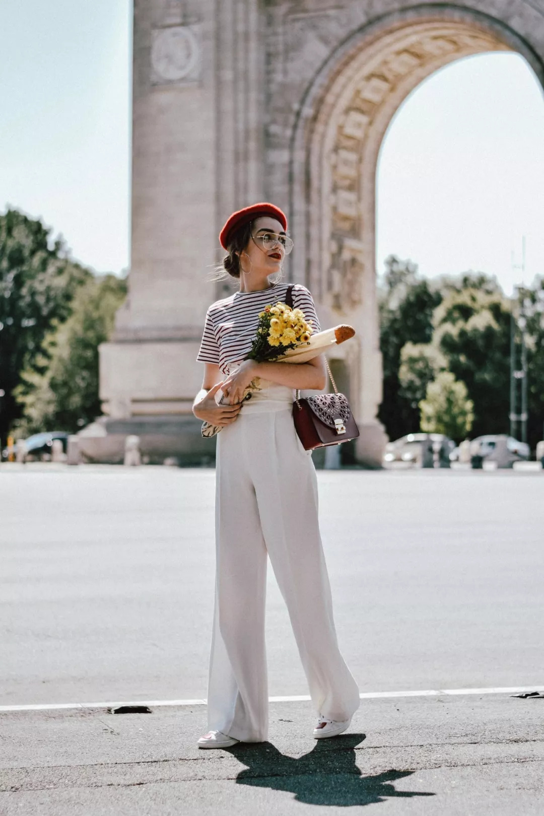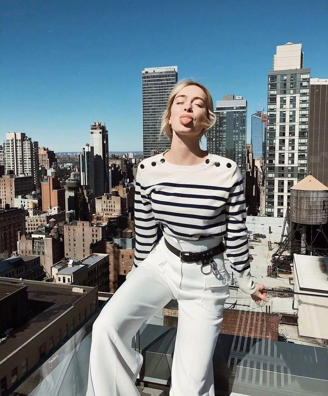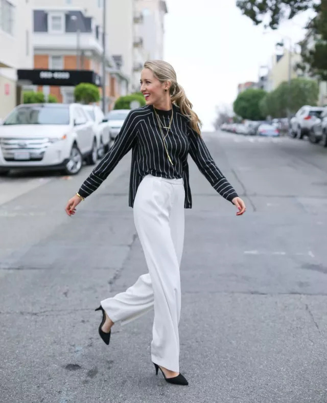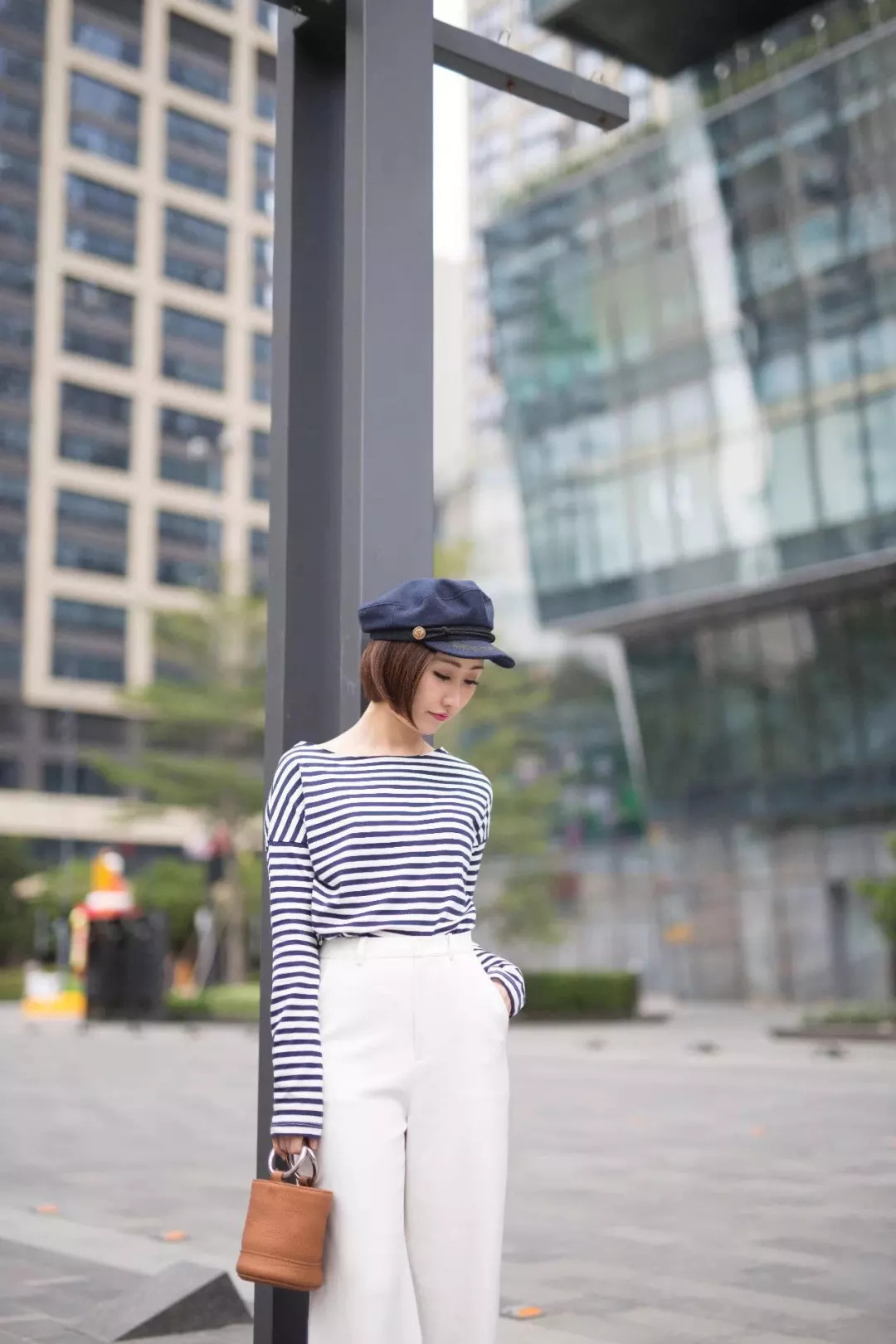 条纹衫和白裤子,都属于法国女人的必备单品了。两者配一起,法兰西风情感受一下~▼