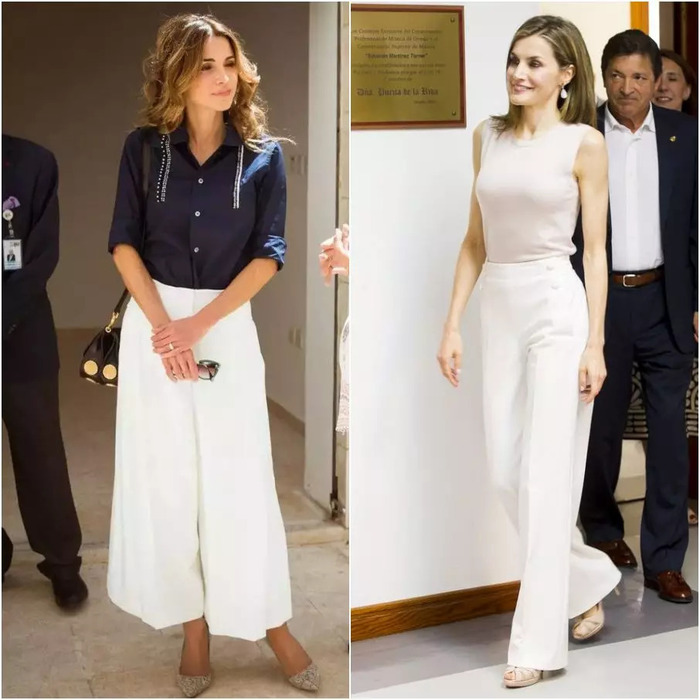 那些会穿的王妃们,也都是人手一条白色阔腿裤,比如之前写过的约旦王后Rania和西班牙王后Letizia。▼