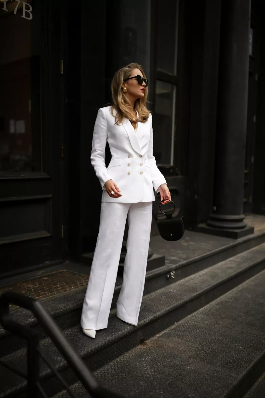 如果你想穿出一米八的气场,那就穿白色阔腿裤+白色西装外套,这也是现在很流行的搭配。▼
