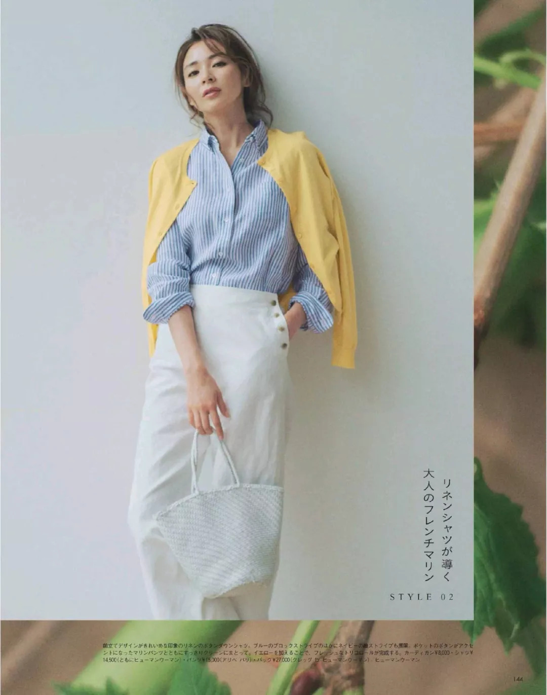 白天在空调房里太冷,在衬衫外披一件鹅黄色的针织衫也很好看。▼