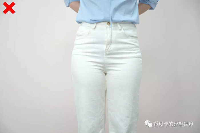 很多梨型身材的人穿白色阔腿裤总会穿出下面这个效果,很紧绷,其实是码数没选对,选大一码就不会这么绷着了。▼