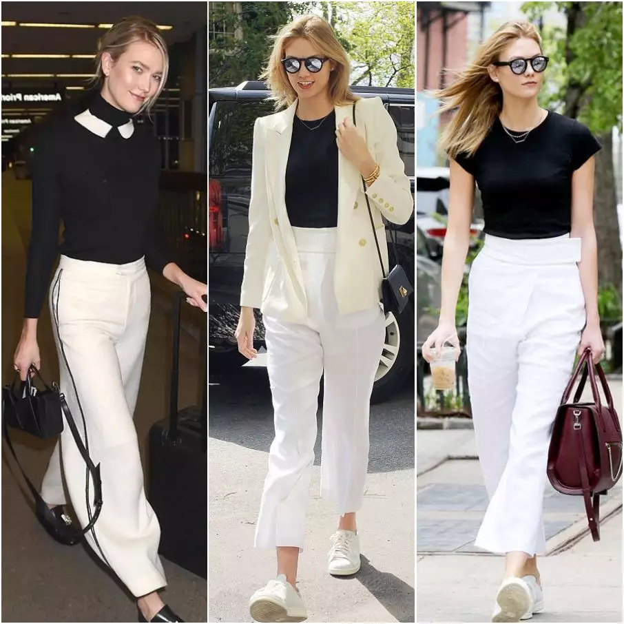 白裤子搭配黑色上衣也不错,打造经典黑白配。