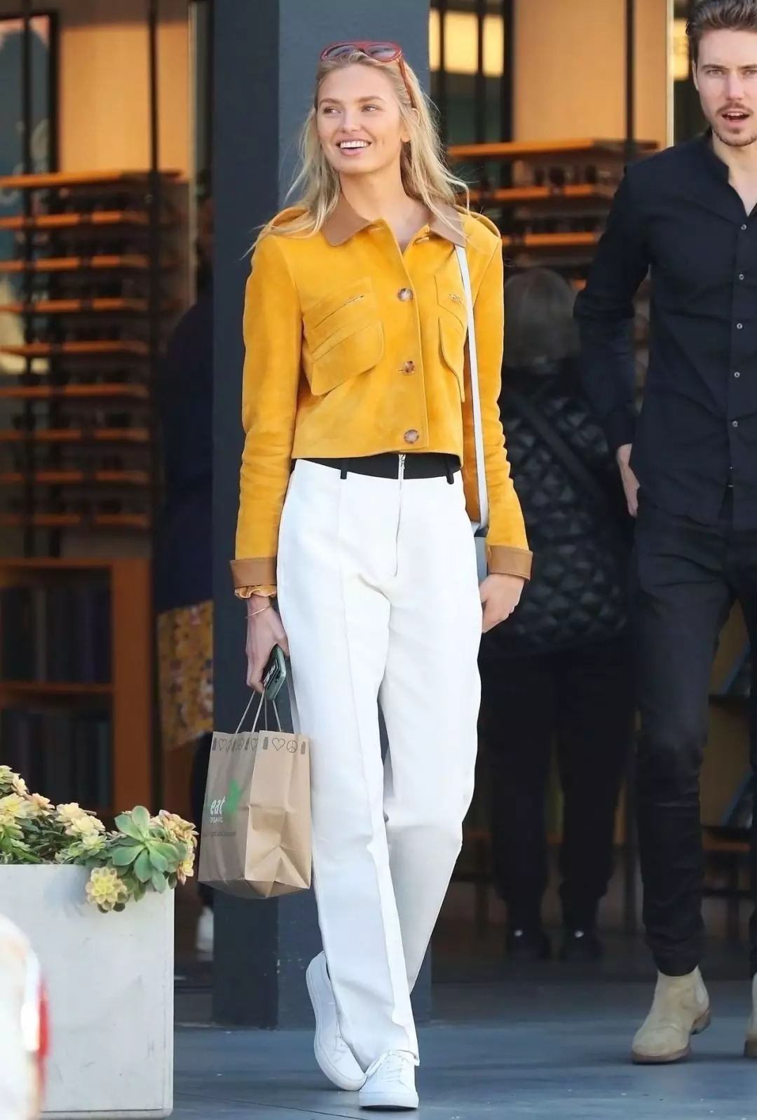前不久,维密超模Romee Strijd配了件黄色麂皮外套。▼