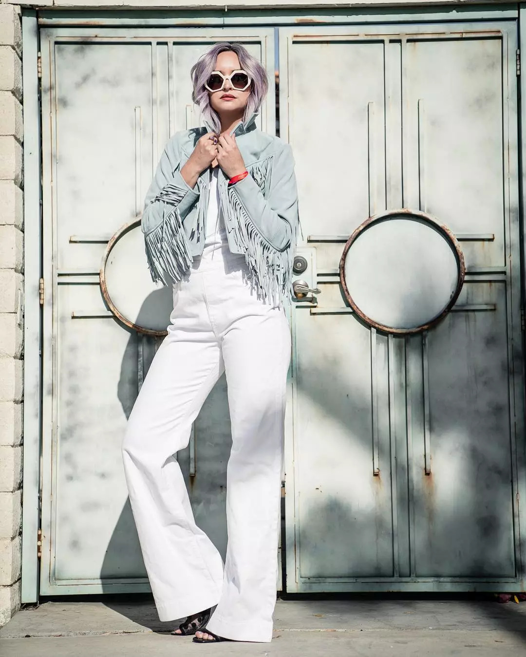 今年流行的马卡龙色,跟白色阔腿裤也很搭。