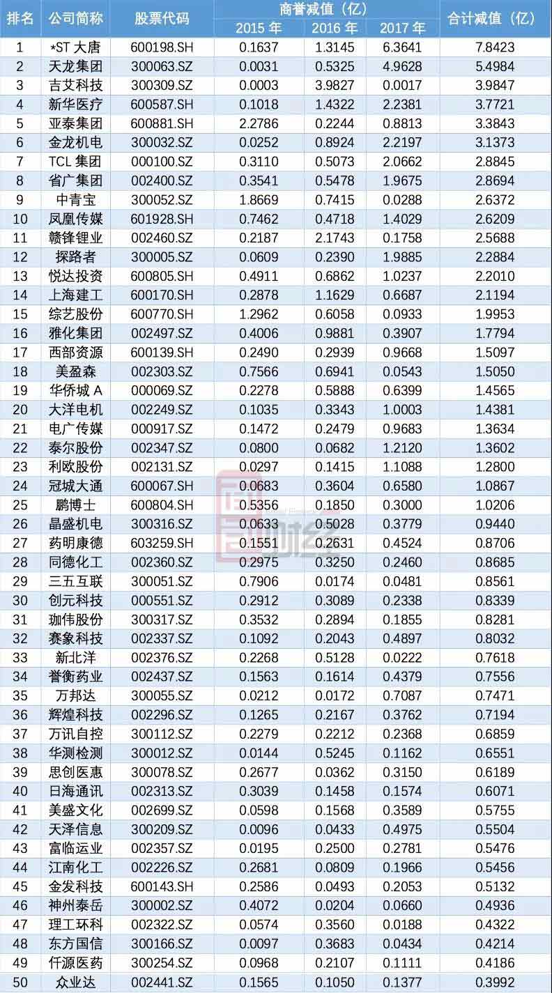 更有26家公司2014至2017年,连续四年商誉减值,名单如下: