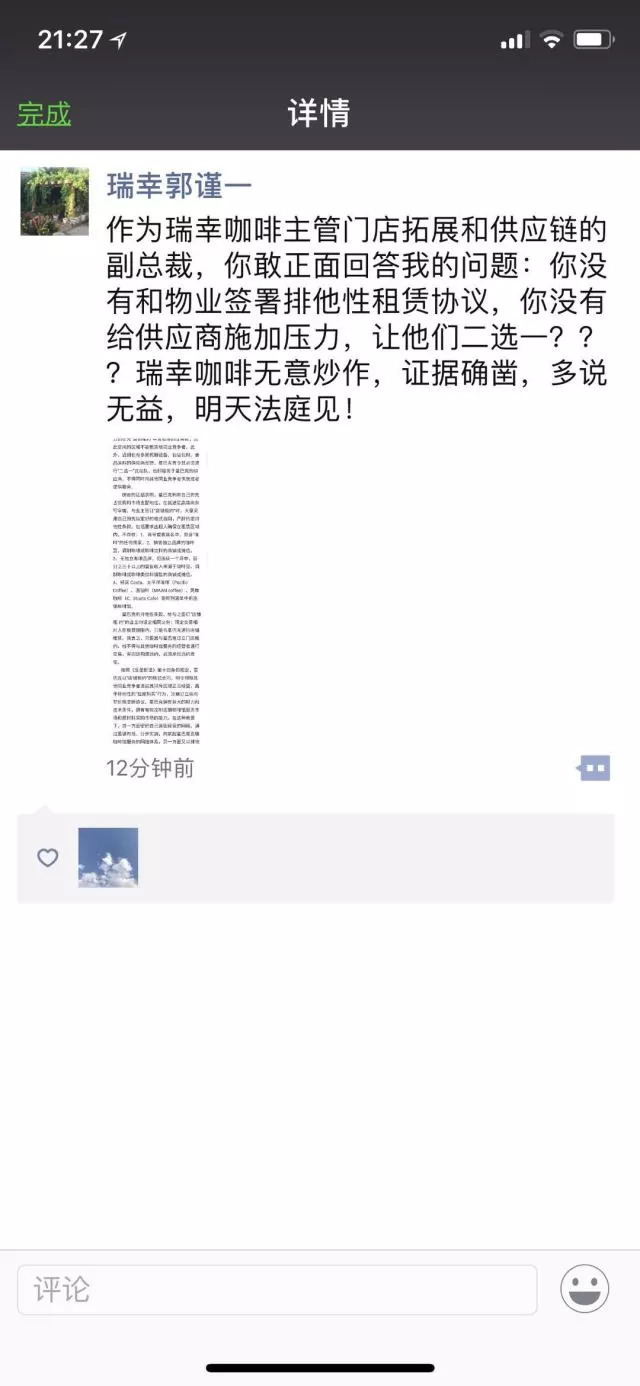 15日当天傍晚,作为瑞幸咖啡主管门店拓展和供应链的副总裁郭谨一在朋友圈“怒怼”星巴克,希望能够直面回应施压供应商和与物业签署排他租赁协议的事实,并再次强调瑞幸手握证据且无意炒作。
