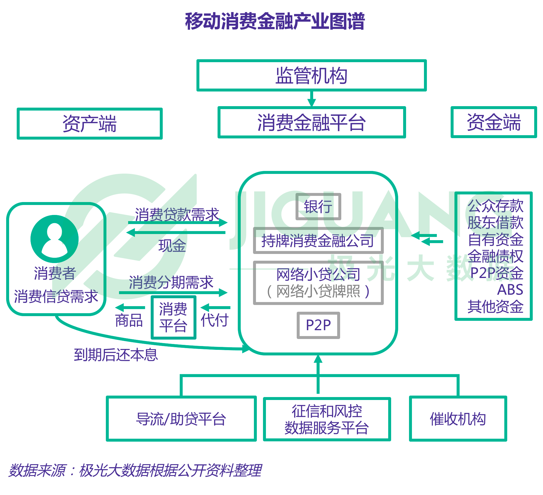 消费金融产业链主要包括资产端、消费金融平台和资金端三部分。消费金融机构或企业根据自身企业情况从合规途径获取资金,借助自身平台或助贷平台获客;满足条件的消费者通过现金模式或代付模式(消费分期)向消费金融平台提出消费信贷需求;征信和风控数据服务平台会在贷前、贷中和贷后提供风控数据服务支持;而催收机构对贷款逾期的客户进行催收;消费金融机构和企业都受到一行两会及相关机构的监管。