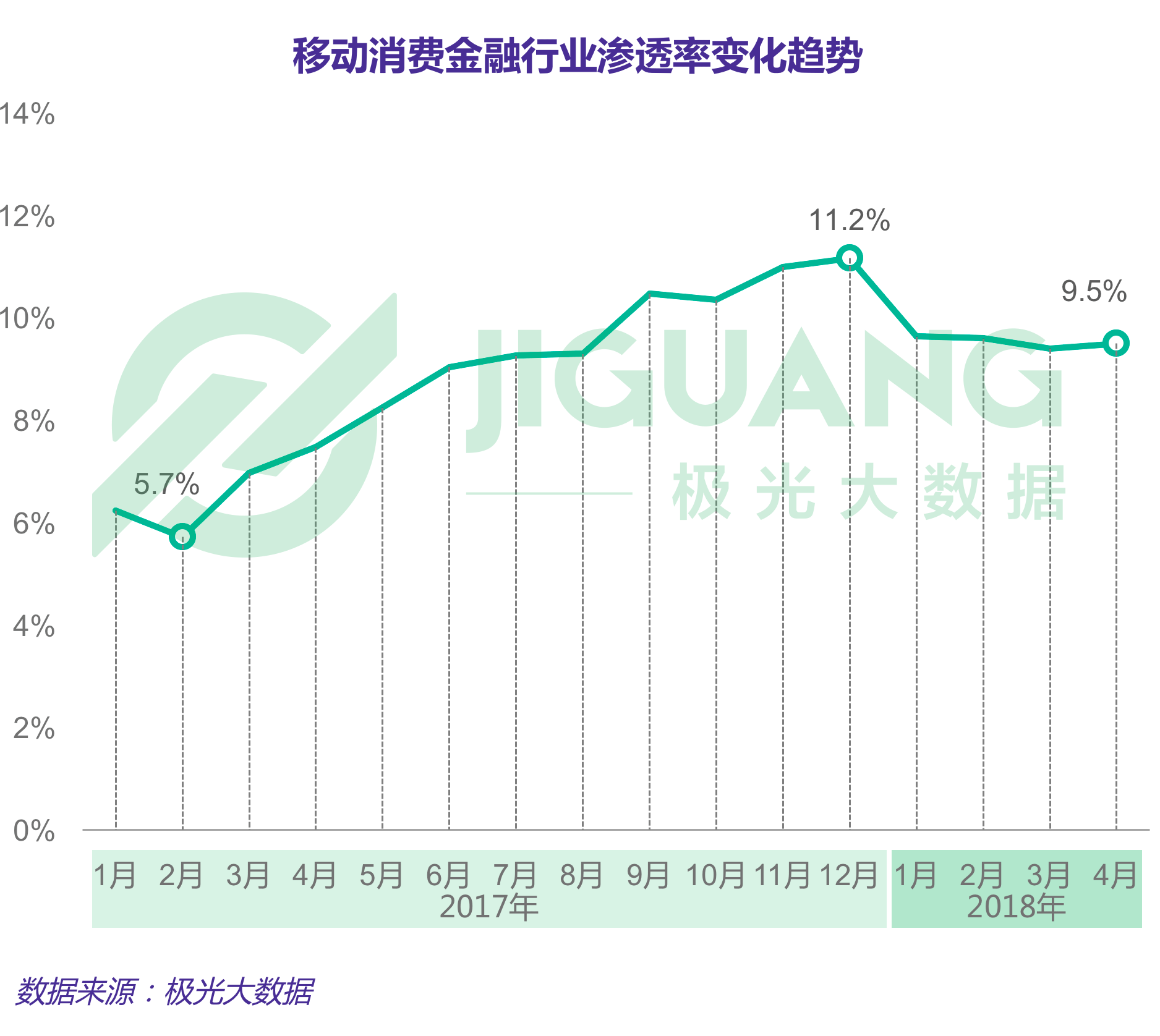 极光大数据显示,从2017年2月开始,移动消费金融行业渗透率不断攀升,在12月达到高峰,渗透率为11.2%,相比最低点2月渗透率增长近1倍;2018年开始,移动消费金融行业渗透率有所回落。