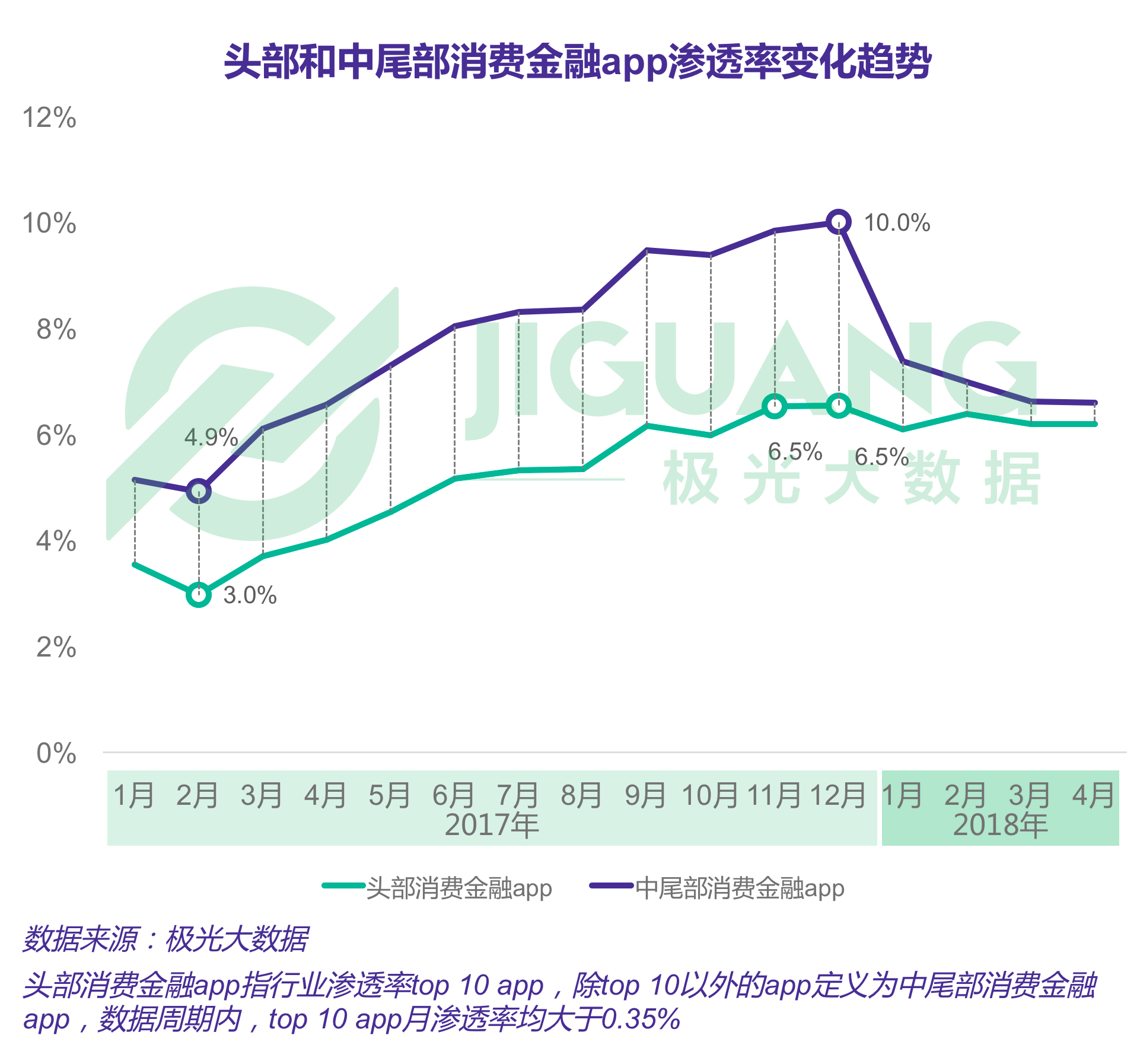 - 2017年12月之后,头部app渗透率保持平稳,中尾部app渗透率出现下滑
