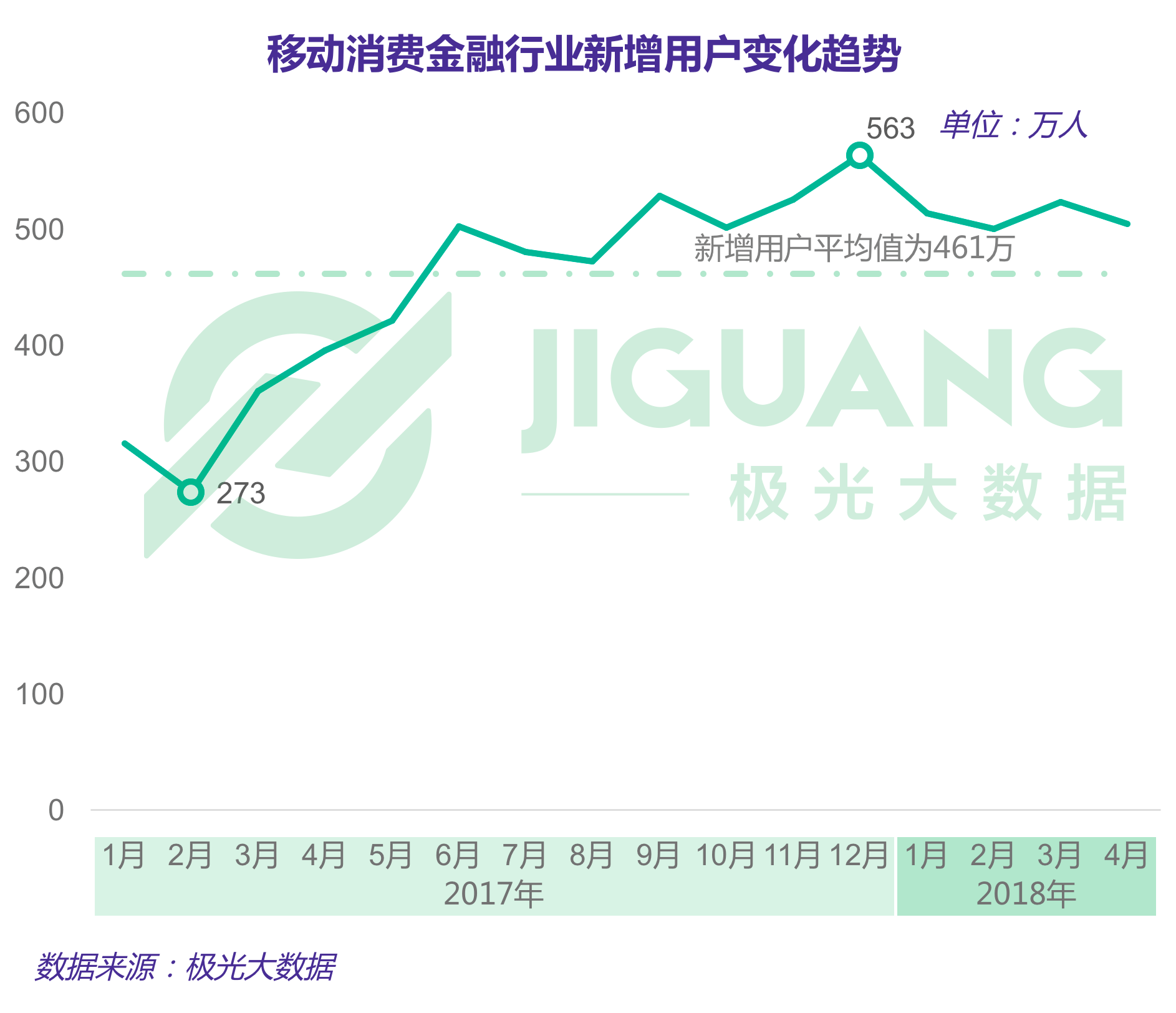 根据极光大数据统计,2017年以来,移动消费金融平均每月新增用户数为461万。2017年2月,移动消费金融行业的新增用户为273万,此后,呈现震荡上升趋势,2017年12月新增用户达525万;2017年12月以后新增用户数有所回落。