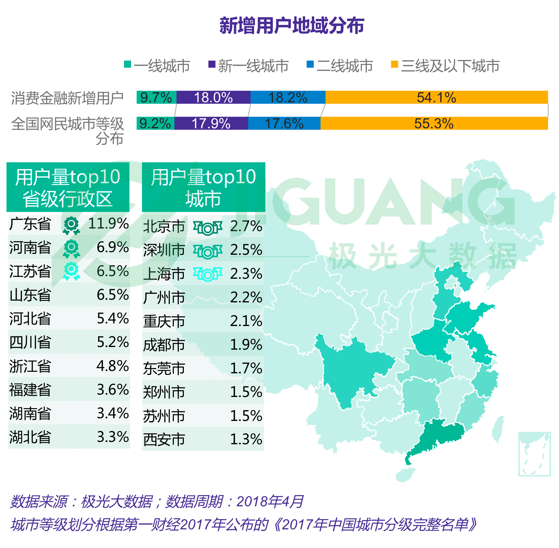 极光大数据发现,移动消费金融新增用户在一、二线城市占比高于全国移动网民城市等级分布,全国每十个移动消费金融新增用户中,至少有一个来自广东省;用户量top 10城市中,北、深、上、广四个一线城市位居用户量前四名,占比分别为2.7%、2.5%、2.3%和2.2% 。