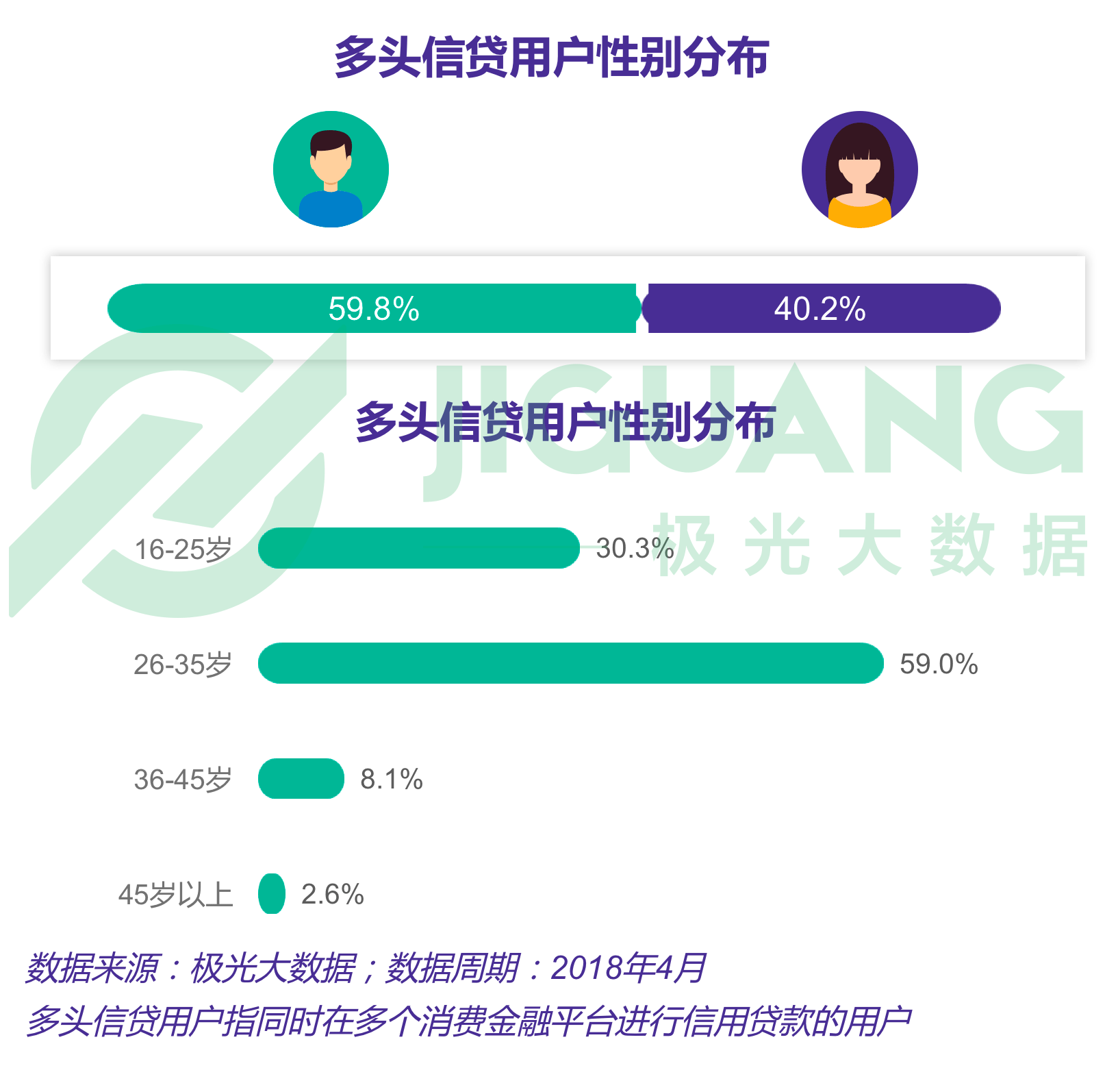 极光大数据显示,移动消费金融多头信贷用户中,男性用户占比59.8%,女性用户占比40.2%;35岁及以下用户占比达89.3% 。