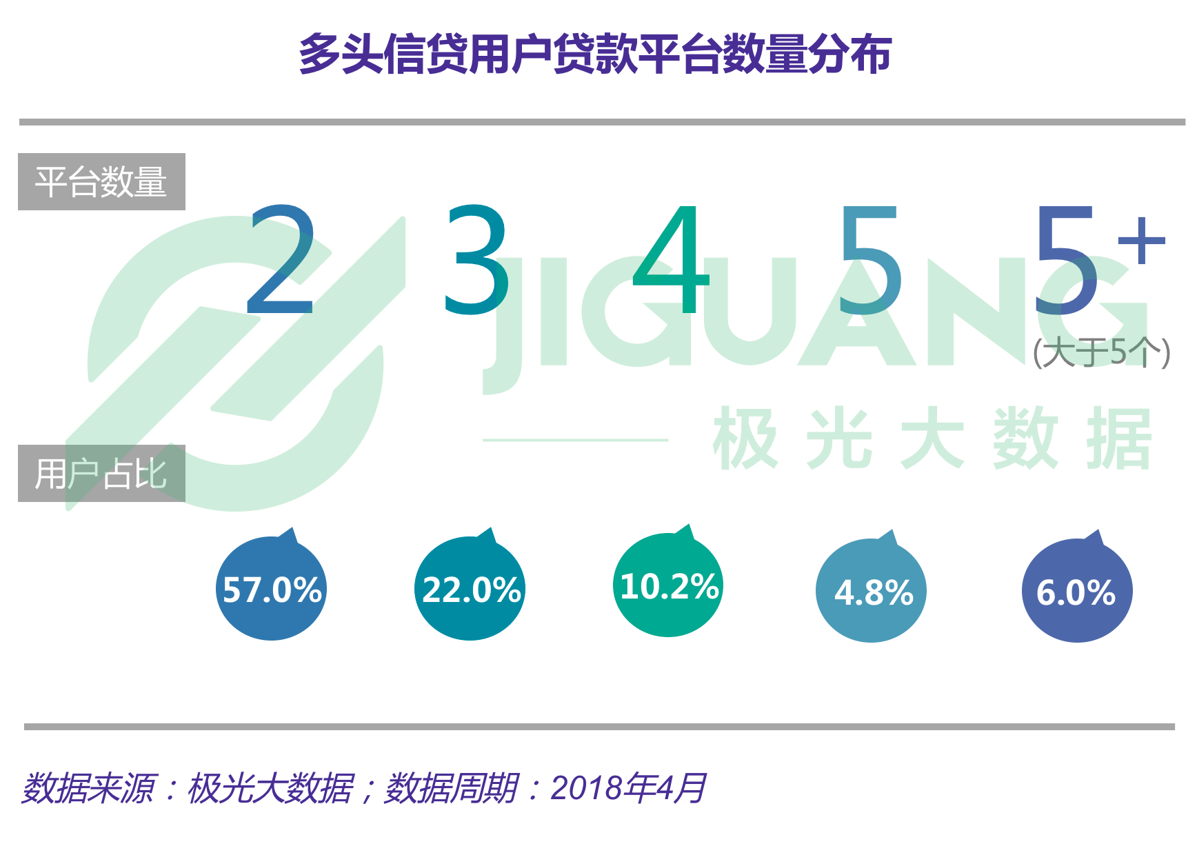 根据极光大数据的统计,多头信贷用户中,在2个平台贷款的用户占比57%,在3个平台贷款的用户占比22%,在超过3个平台贷款的用户达21% 。