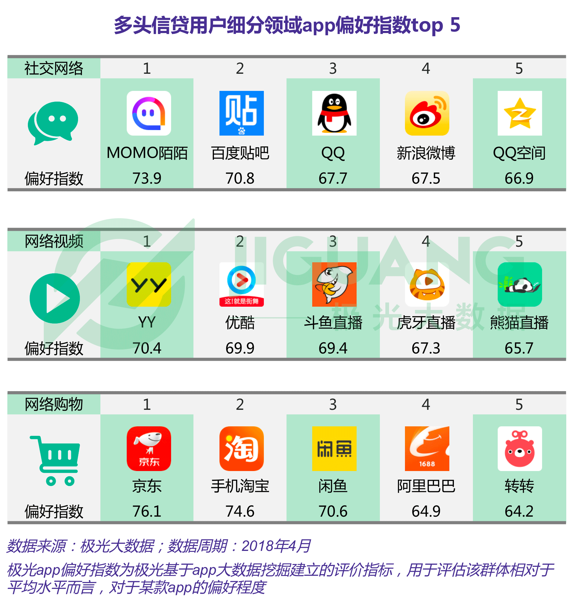 极光大数据显示,在社交网络领域中,MOMO陌陌、百度贴吧和QQ是多头信贷用户最为偏好的三款app;在网络视频领域app偏好指数top 5中,出现四款直播类app,分别是YY、斗鱼直播、虎牙直播、熊猫直播 ;在网络购物领域,京东的偏好指数最高。