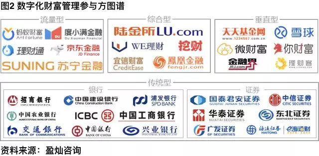 随着投资者对财富管理数字化产品和服务需求的增加,各金融相关机构不断深化金融科技布局,探索数字化财富管理之道,我国参与方主要可以分为四类:流量型互联网企业、综合型互联网金融平台、垂直型资讯平台及银行、券商等传统型金融机构。