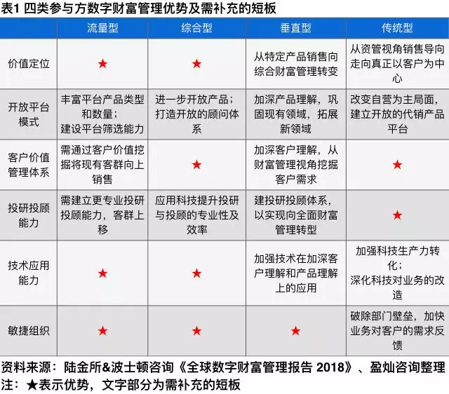 从现状看,流量型和综合型企业基于长期金融科技探索及逐步搭建成的资产类型丰富的综合理财平台,在数字化财富管理布局上有一定的优势,而垂直型、传统型机构起步较晚,价值定位、开放平台模式和技术应用能力等多个方面都需要努力提升。
