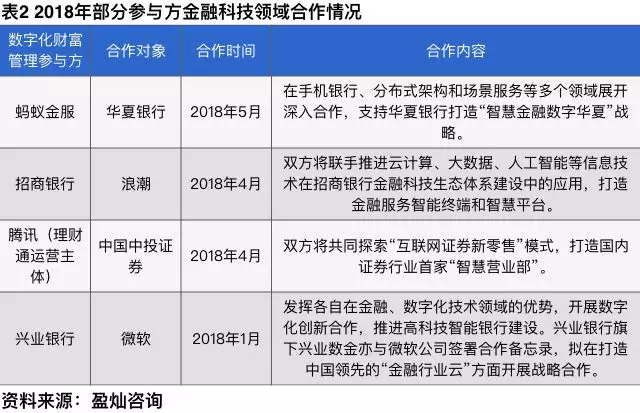 在积极探索财富管理数字化的同时,各参与方之间也在不断推进金融科技合作。2017年国有五大行陆续与百度、阿里、腾讯、京东及苏宁金融签订战略合作协议,在云计算、大数据、人工智能等领域展开深入合作,而2018年京东金融、蚂蚁金服等相继弱化金融属性,强调科技公司属性。从四类参与方起源来看,在科技、金融资产、资讯等领域各有不同的优势,未来或许会继续合作,进一步深化金融科技探索,形成优势互补,共同推进我国财富管理数字化进程。