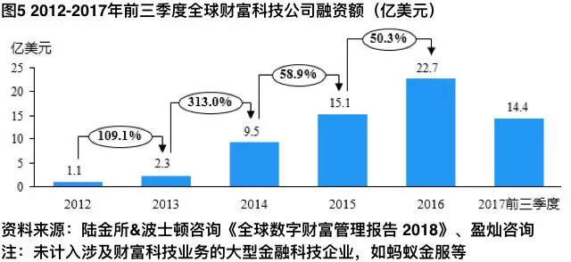 随着金融科技研究的深入,财富科技公司在资本市场的价值认可度也在明显提高。据《全球数字财富管理报告 2018》数据显示,2012年至2017年三季度,全球财富科技公司融资额已达65.1亿美元,除2017年外各年融资额涨幅均在50%以上。