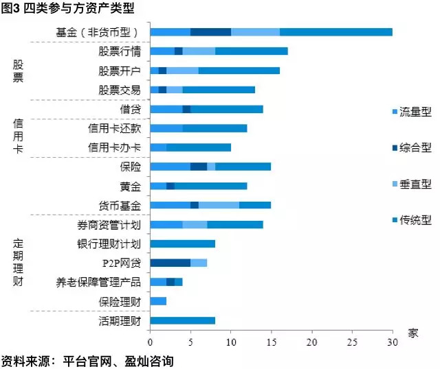 布局借贷、信用卡、黄金及活期理财产品的参与方类型相对较少,主要参与方为银行、证券等传统型金融机构。流量型机构目前布局主要在借贷、信用卡领域,少数机构涉及黄金业务。垂直型机构布局主要集中在基金(含非货币型和货币型)、股票及定期理财领域,借贷、信用卡等业务参与度较低。