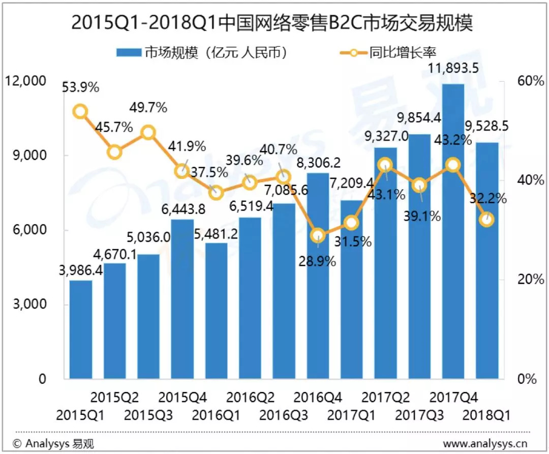 根据Analysys易观发布的 《中国网络零售B2C市场季度监测报告2018年第1季度》数据显示,2018年第1季度,中国网络零售B2C市场交易规模为9528.5亿元人民币,同比增长32.2%。