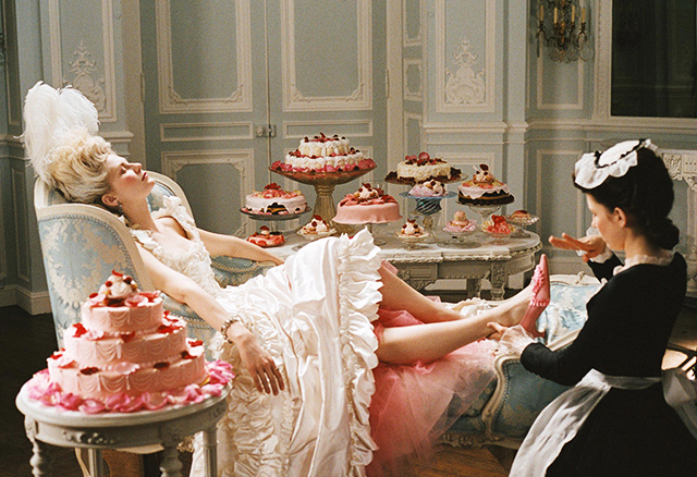 法国人要首先感谢嫁给亨利二世的凯瑟琳皇后(Catherine de' Medici,来自佛罗伦萨最富名望和权势的美第奇家族),这个小个子的女人不仅给16世纪的法兰西带来了高跟鞋,她陪嫁的随行里还有制作马卡龙的糕点师。但马卡龙史上最为著名,也最为显赫的拥趸,当属路易十六的皇后玛丽·安托瓦内特(Marie Antoinette)。这个18 世纪的fashion icon捧红的不仅有假发,还有马卡龙。玛丽自幼便培养了对这个小点心的爱,在她5岁时甚至将自己的帽子命名为“马卡龙”。在电影《绝代艳后》中,导演索菲亚·科波拉用Laudureé的马卡龙做成金字塔装饰凡尔赛宫。