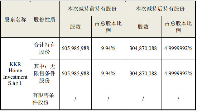 青岛海尔5月16日晚间的公告显示,公司股东KKR Home Investment S.à r.l.(下称KKR)在过去的半年多时间里先后三次对青岛海尔进行减持,累积减持3.01亿股,占公司总股本的4.94%。减持后,KKR持股比例降至4.9999992%。