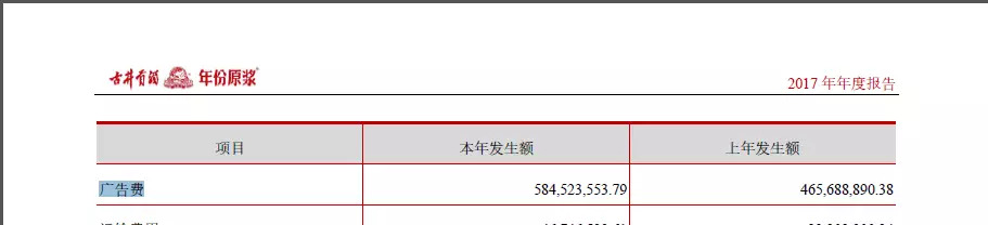 以2017年为例,古井贡酒的广告费高达5.84亿元,同时,归属于上市公司股东的净利润约为11.49亿元;也就是说,古井贡酒的广告额度相当于净利润的50%以上。