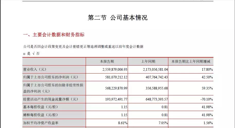 2018年第一季度,古井贡酒实现营业收入约为25.6亿元,同比增幅在17%以上;归属于上市公司股东的净利润约为5.81亿元,和2017年第一季度4.08亿元相比,增幅在42%左右。