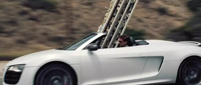 分享两个关于奥迪R8的两个段子。特技导演曾计划让R8与剧中反派相撞翻车,所以设计了车子开上斜坡,但令人意外的是,奥迪R8死活就是翻不了车。