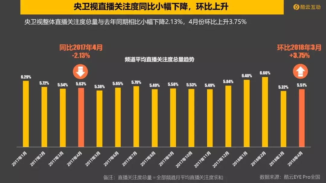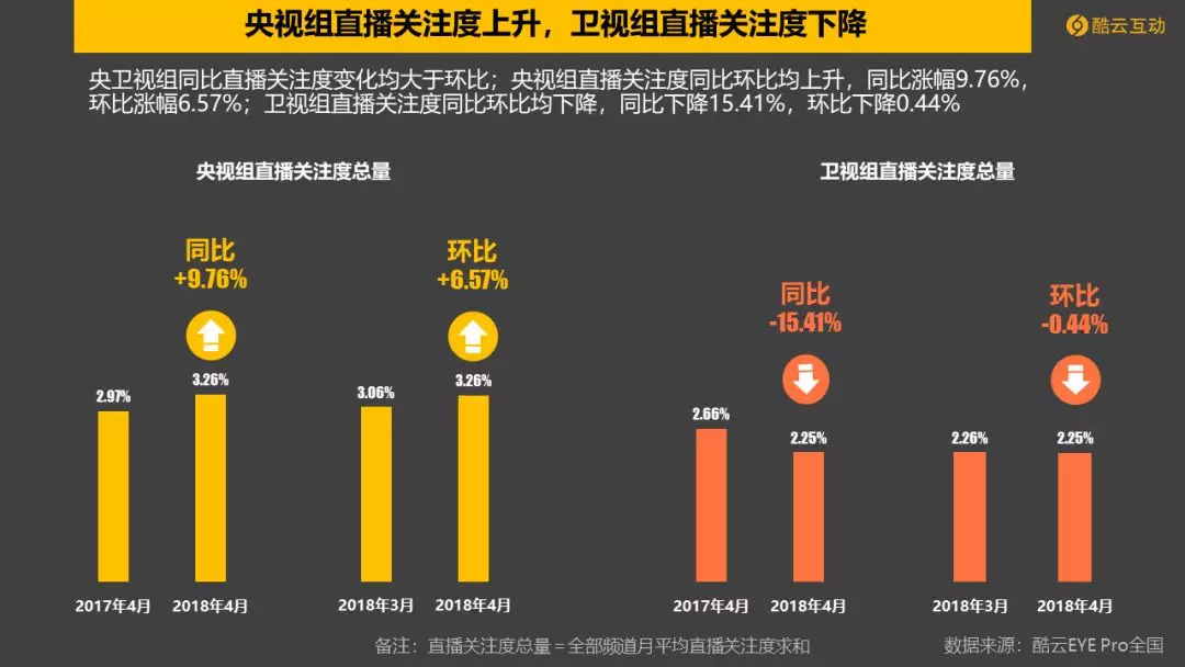 央卫视整体直播关注度总量与去年同期相比小幅下降2.13%,4月份环比上升3.75%。其中,央视组直播关注度同比环比均有所提升,卫视组同比环比均下降。