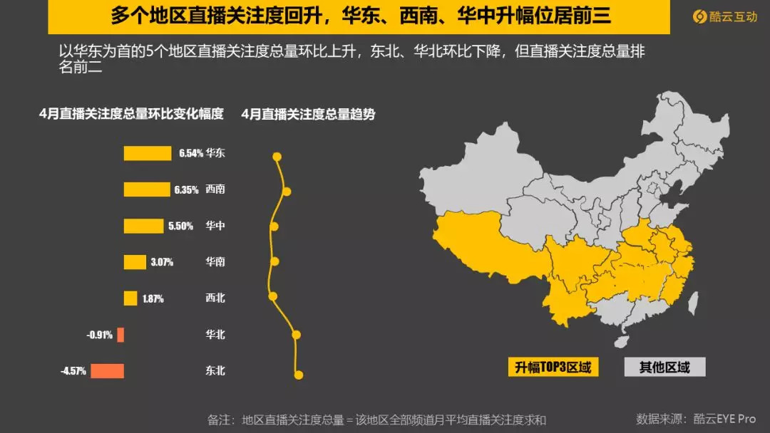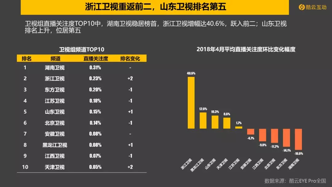 卫视组:湖南卫视占据榜首,浙江卫视直播关注度增幅达40.6%,跃入前二;山东卫视排名提升,进入前五。