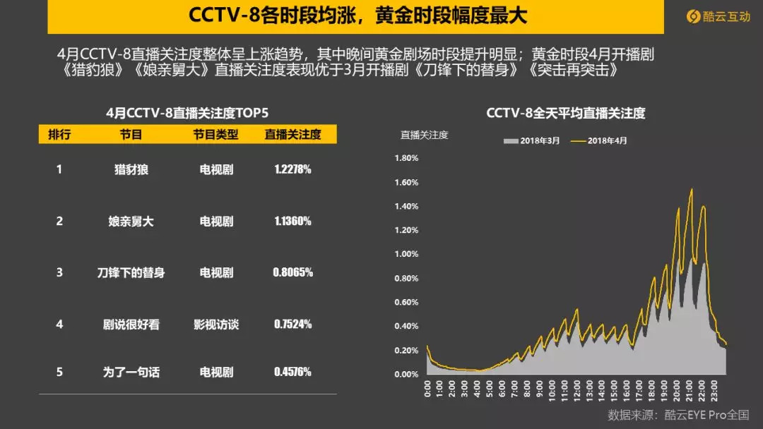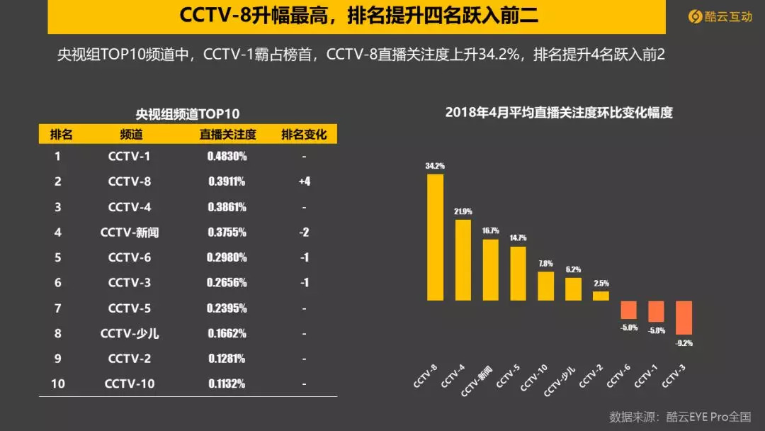 央视组:CCTV-1稳居榜首,CCTV-8直播关注度上升34.2%,排名提升4名,跃入前二。