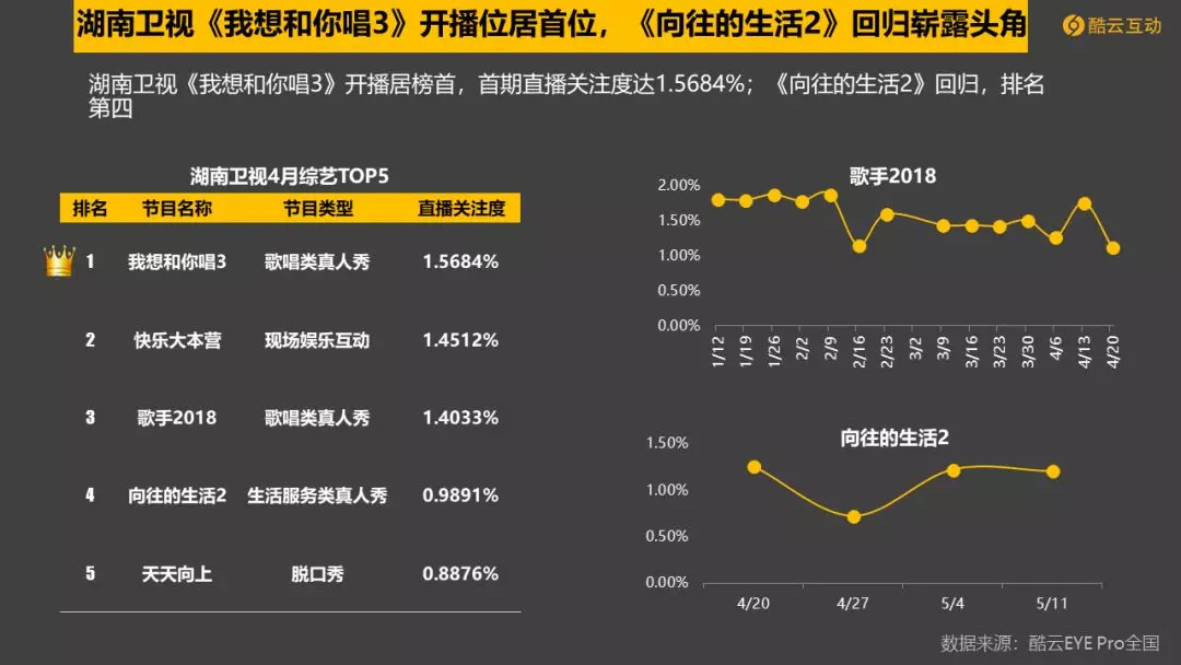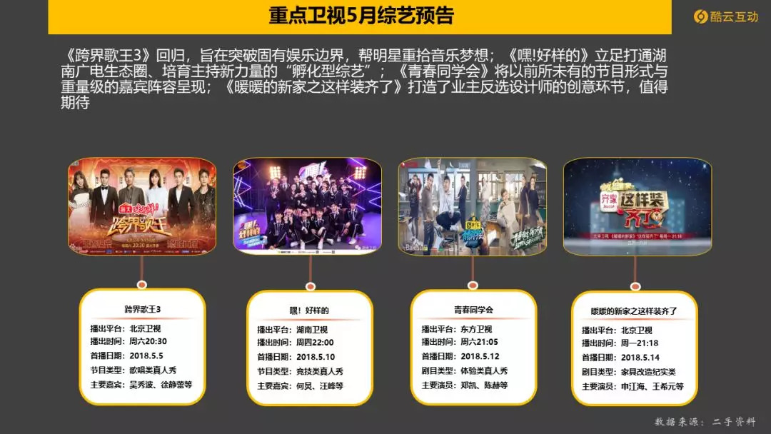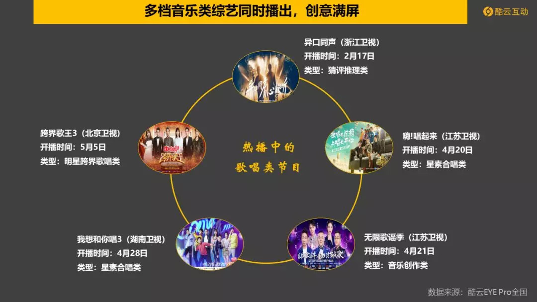 1. 《异口同声》(浙江卫视)、《嗨!唱起来》(江苏卫视)、《无限歌谣季》(江苏卫视)、《我想和你唱3》(湖南卫视)、《跨界歌王3》(北京卫视)多档音乐类综艺同时播出。
